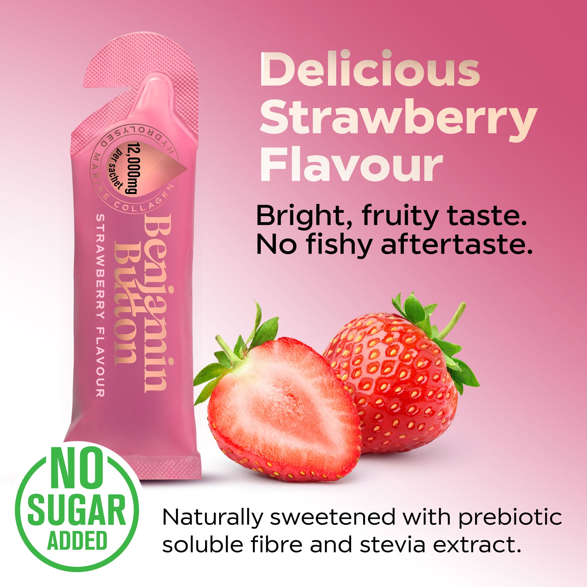 Perimenopauzální kolagen jahodové sáčky – balení 14 kusů (zásoba na 2 týdny) – 12 000 mg mořského kolagenu s vitexem, vitamíny a kyselinou hyaluronovou
