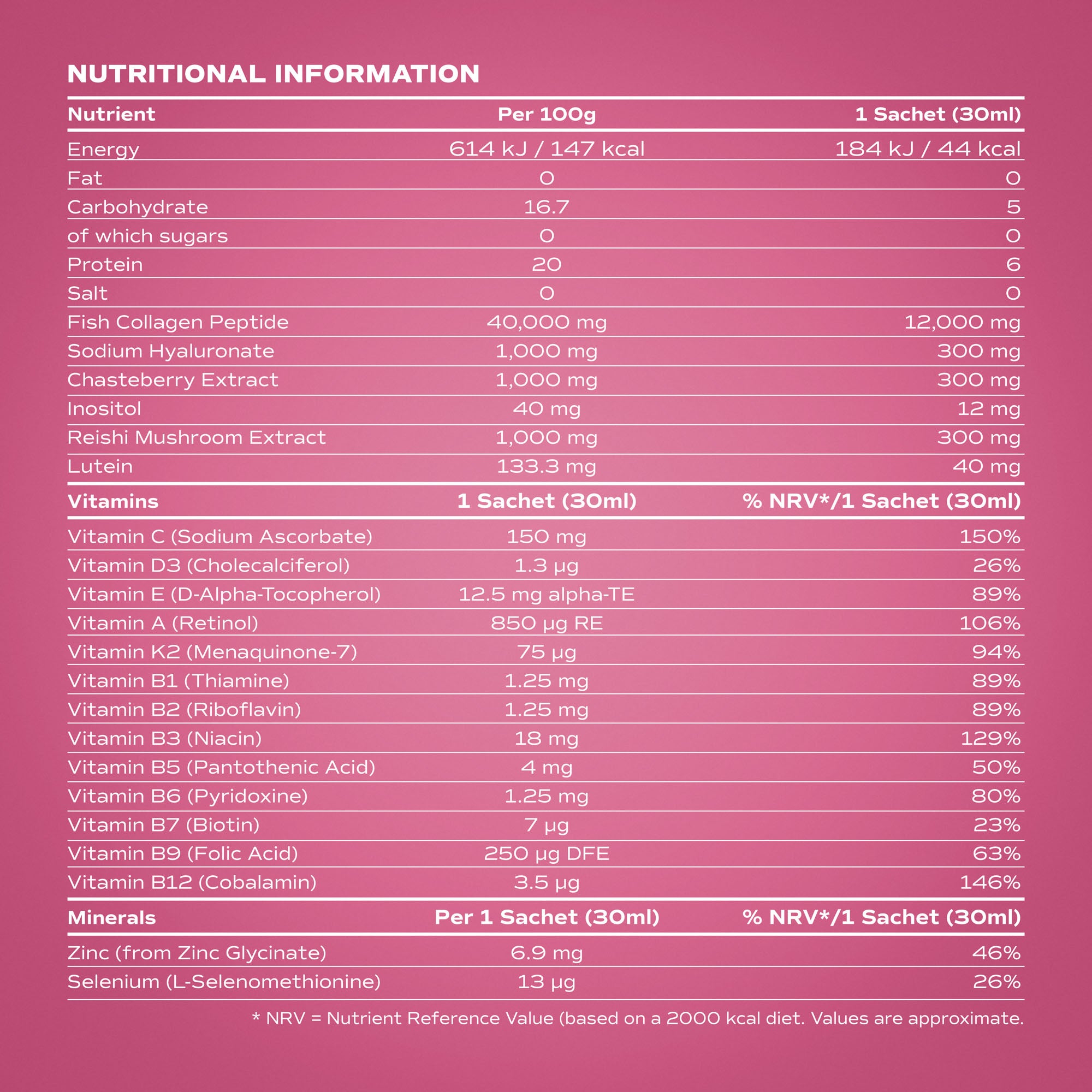 Každý sáček o objemu 30 ml obsahuje 12 000 mg vysoce kvalitního mořského kolagenu a vitamíny A, B1, B2, B3, B5, B6, B7, B9, B12, C, D3, E, K2, neobsahuje ořechy, lepek, laktózu, sóju ani umělé přísady a sladidla a je halal. Každý sáček obsahuje 44 kalorií a 6 g bílkovin.