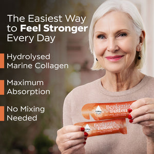 Support healthy skin, hair and joints with Benjamin Button Marine Collagen Liquid Sachets, delivering 12,000mg of hydrolysed marine collagen in a ready‑to‑drink 30ml sachet. Each serving combines collagen peptides with Vitamin C and Hyaluronic Acid to help maintain hydration, elasticity and overall wellbeing, all in a refreshing natural orange flavour.